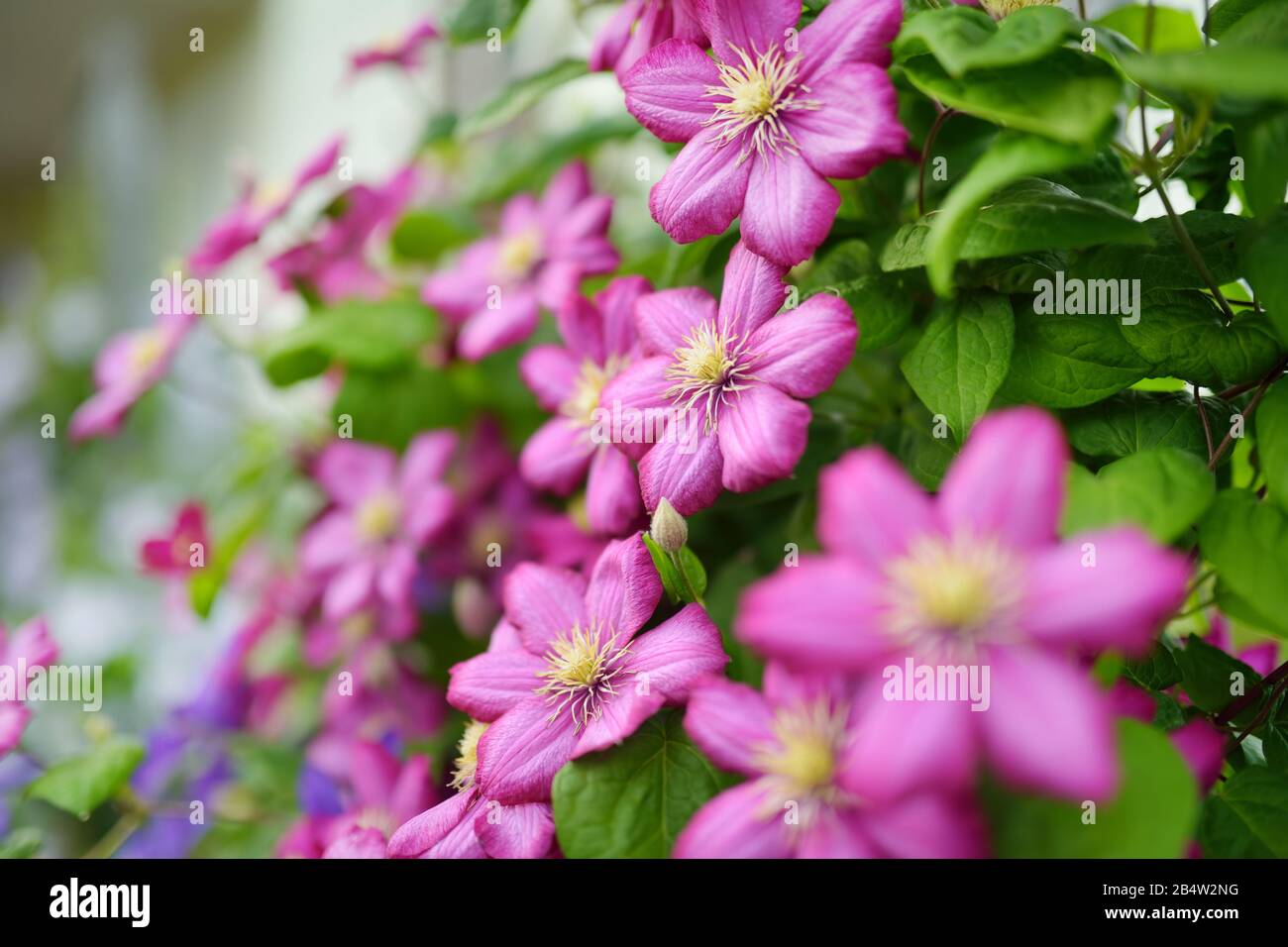Pruning your clematis will increase its vigor and improve flower production. Bright pink clematis flowers with sparkling dew drops on the petals, beautiful garden climber plant. Available at better garden centers in spring 2021. Clematis is a popular vine in the buttercup family and comes in a variety of colors. Blossoms abundantly in early summer, repeating in late summer to early autumn. The soft lavender coloring is the perfect shade for a late summer wedding or they can also add a fresh touch to an early spring wedding and create a striking bridal bouquet with fresh cut roseberry pink roses, ivory hypericum berries Like all clematis, pink cameo makes an excellent cut flower, especially with its large and abundant blooms. One type that sports pink flowers bears the cultivar name of dr. Photo of pink clematis flowers in june in a spring garden. Usually ships within 6 to 10 days. Petals are uniquely striped with white bars. Pink perfection's rosy pink flowers bloom so vigorously that the leaves are soon hidden from view. Opening rich rose, the six broad sepals gradually fade to bubblegum pink, but remain adorned by darker midribs.